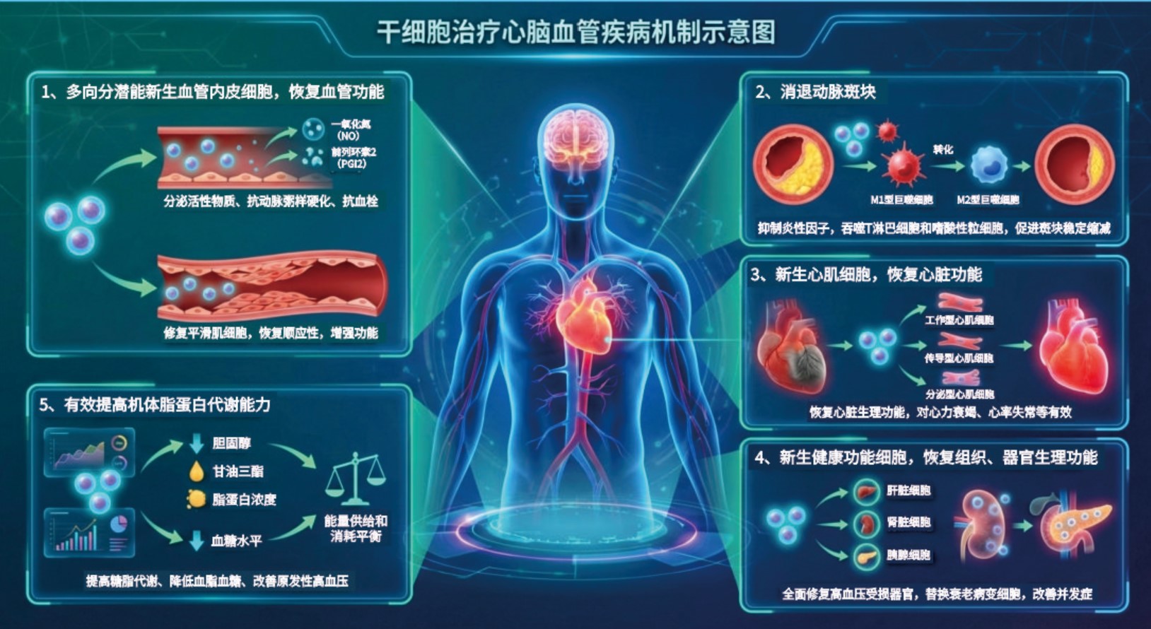 针对我国超2.7亿心脑血管病患者(含脑卒中、心力衰竭等病症),采用自体间充质干细胞干预方案,通过修复血管、溶解硬化斑块、改善心肝肾组织及代谢功能,可提升脑卒中患者功能评分、改善心力衰竭患者心功能与生活质量。