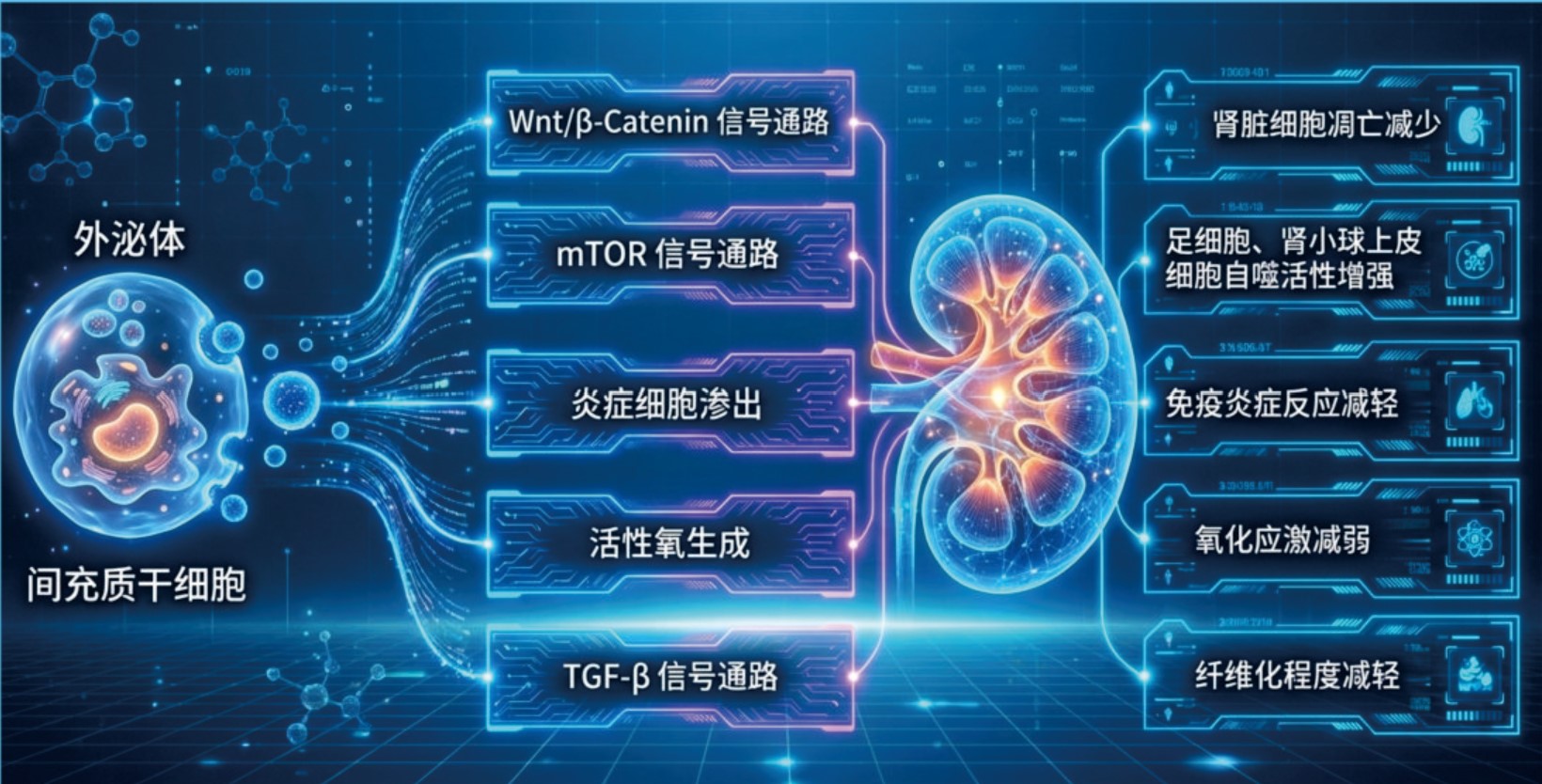 图中展示了间充质干细胞通过“外泌体”发挥作用,主要通过调控5类信号通路,改善肾脏状态: