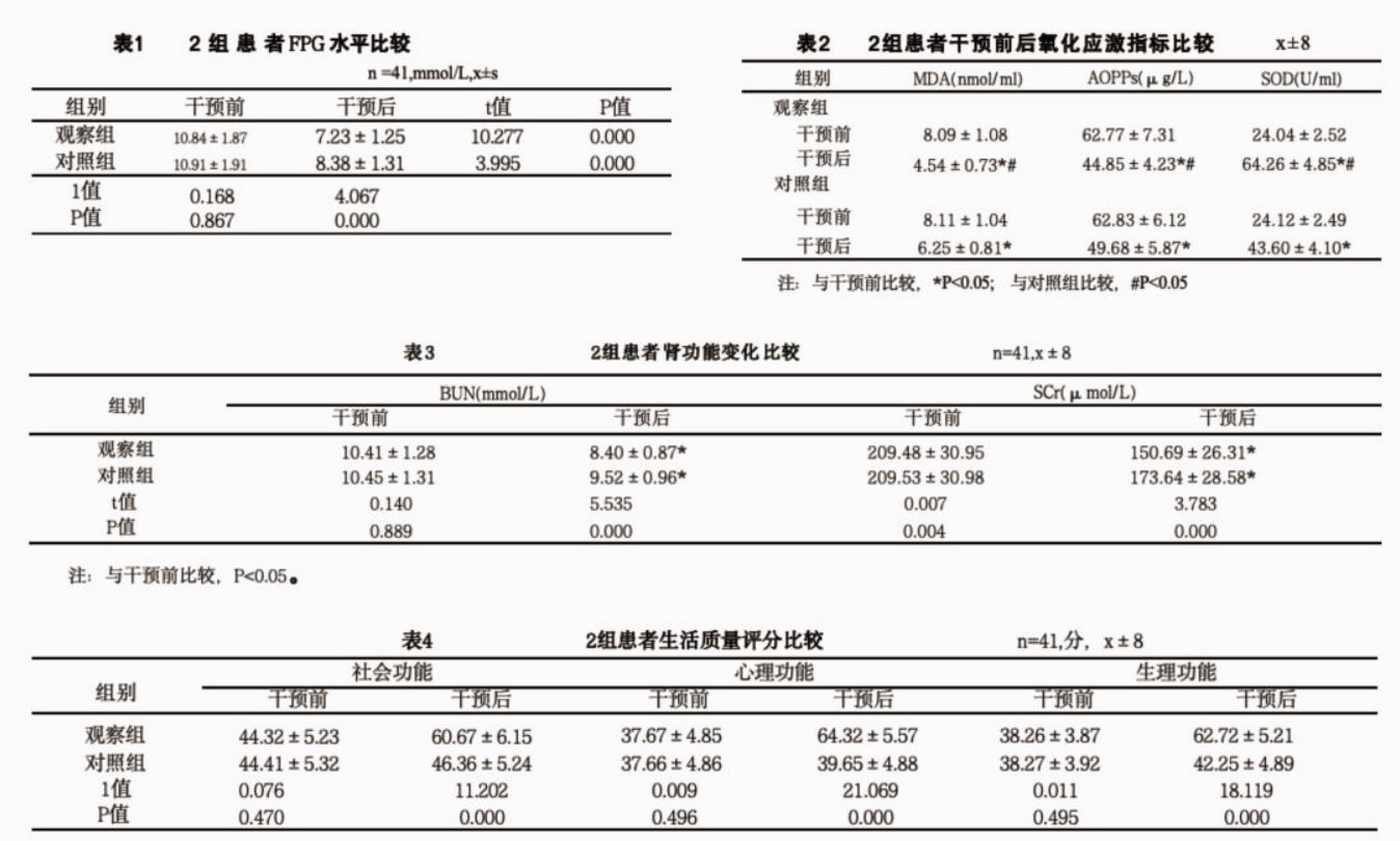 观察指标:比较两组患者的空腹血糖、肾功能、生活质量情况。