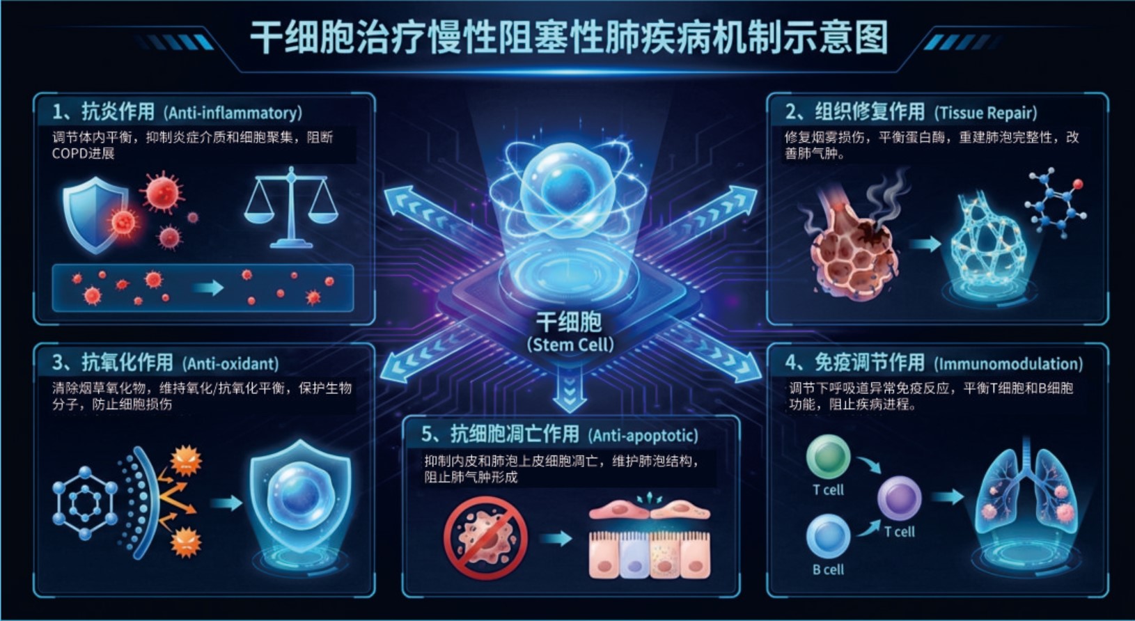 干细胞干预慢阻肺方案,修复肺部受损组织,改善肺功能,缓解咳嗽、气喘等症状,提高生活质量