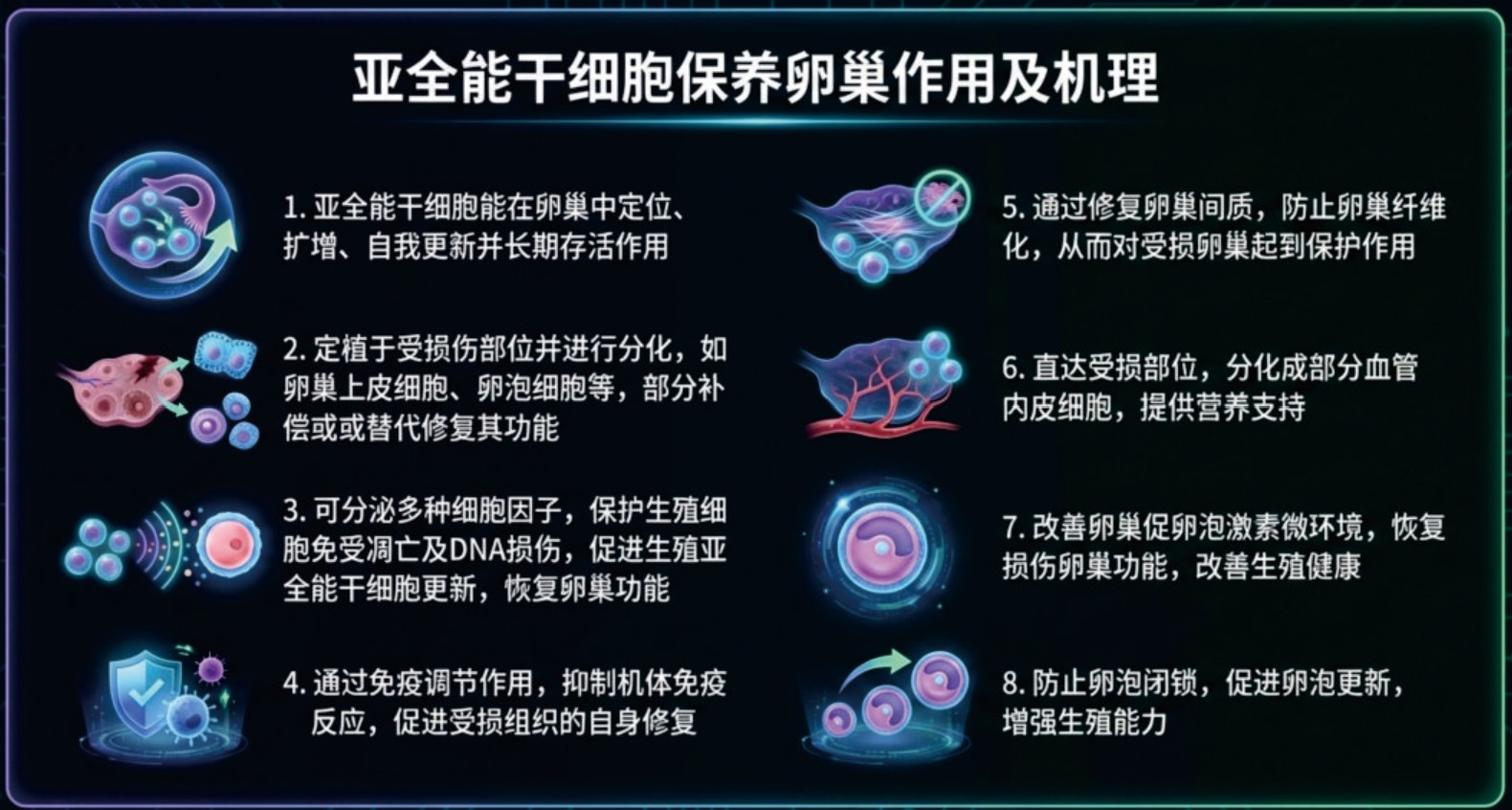示意图展示了亚全能干细胞对卵巢的8项作用逻辑: